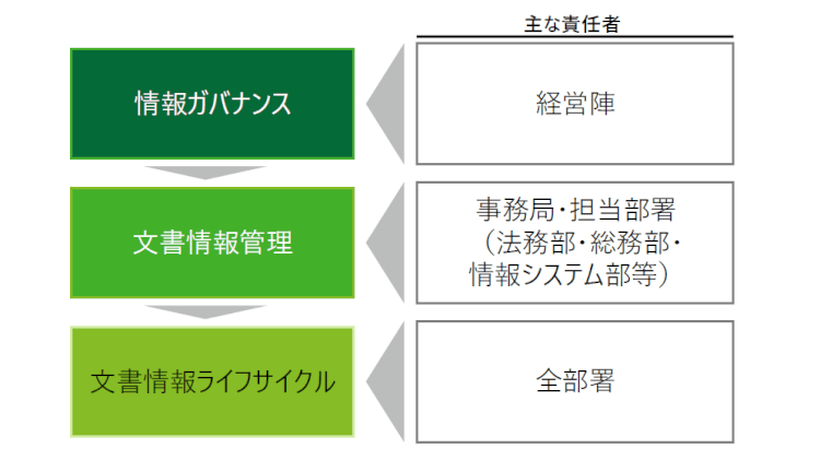 情報ガバナンスは、プロジェクトの立案に関与し承認する経営層、文書情報の管理を担う事務局と担当部門(法務、総務、情報システムなど)、そしてルールに基づき、保存や破棄などの判断をするすべての部署。組織全体が関与、行動することで機能します。
