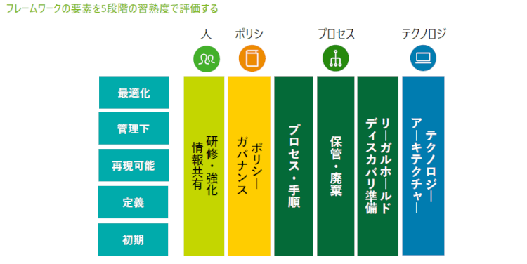 情報ガバナンスは、前述したようなポイントを実践していくことになりますが、企業の実務と情報管理の体制、システムの状態によってもアプローチは異なります。多くの組織が共通に利用できる指針として、調査会社などが「フレームワーク(枠組み)」を提供していますが、そのエッセンスをご紹介しましょう。