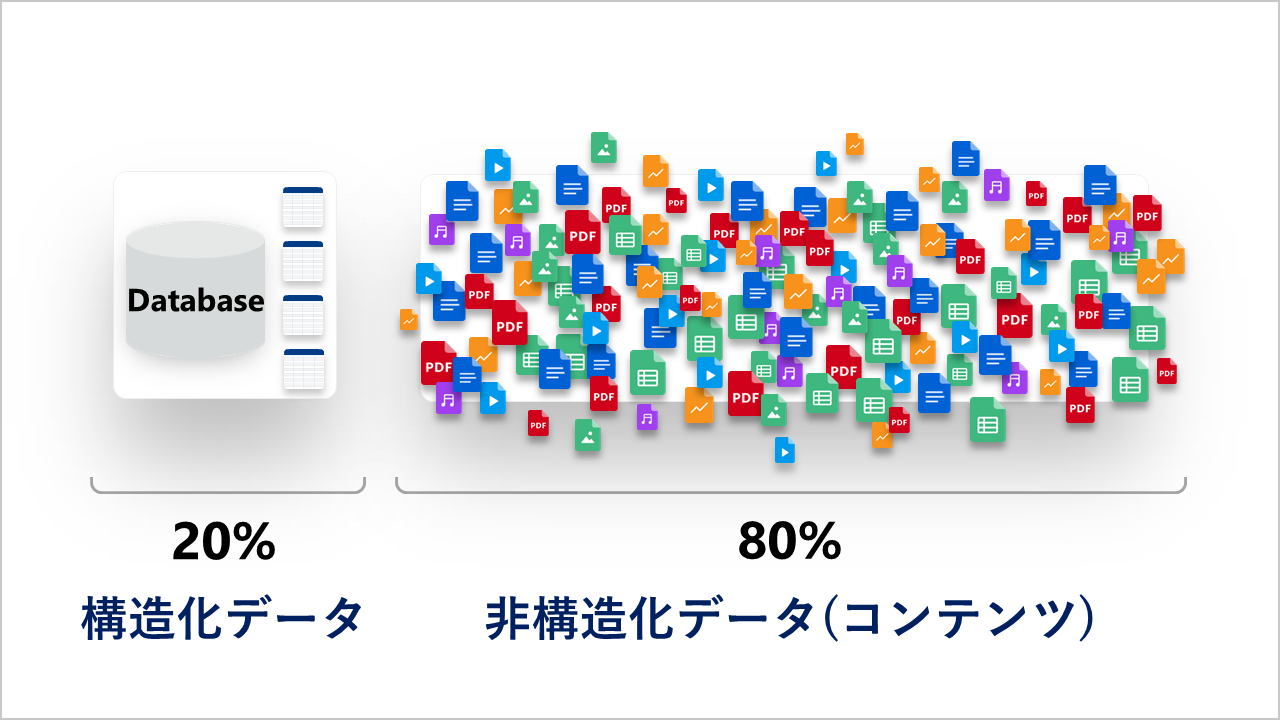 そして、企業が持つ情報の2割は「構造化データ」であり、残りの8割は「コンテンツ」であると言われています。この割合は、計算根拠が明示されているわけではなく、やや都市伝説的な側面もあるのですが、皆さんが仕事上で扱っている情報が「データ」なのか?「コンテンツ」なのか?と改めて考えていただくと、この「二八ルール」も強ち間違いではないと感じられるかと思います。
