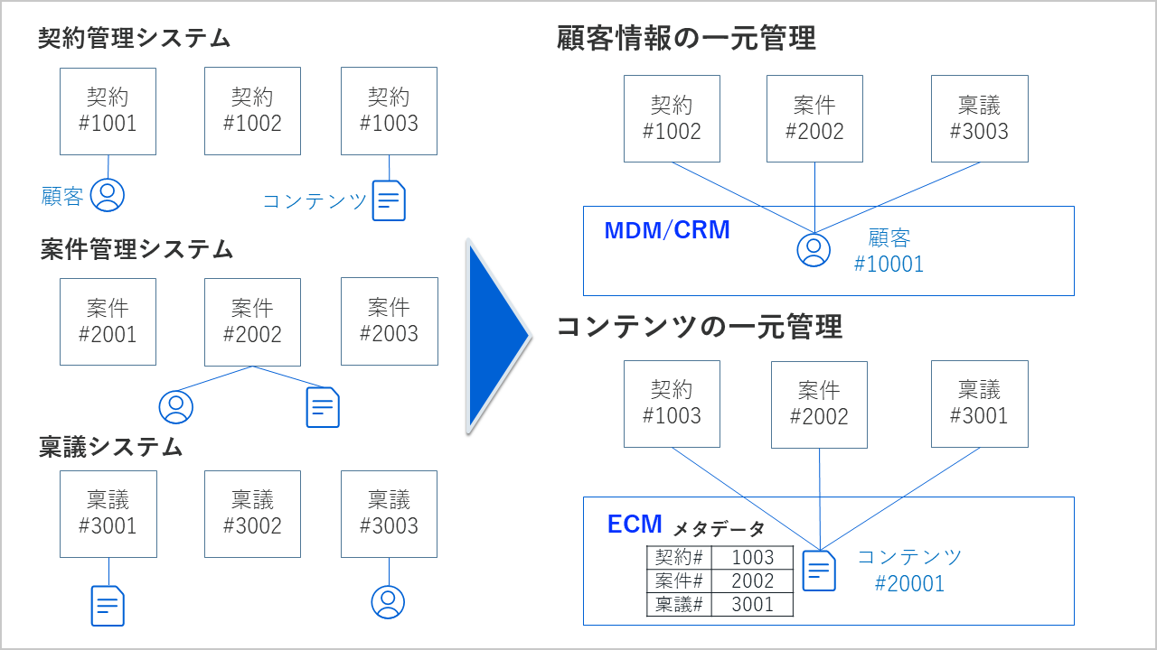 「コンンテンツ管理」という言葉が多くの人に知られることになったきっかけとしては、2005年にAIIM(Association for Information and Image Management)が定義した「エンタープライズコンテンツ管理(Enterprise Content Management)」という言葉が挙げられるかと思います。ソフトウェアの世界に「ECM」という新しいカテゴリが誕生し、Documentum、OpenText、Stellent、FileNetなどのベンダーが脚光を浴びたのがこの時代です。ECMが先進的だったのは「コンテンツセントリック」という思想です。例えば、図2の左側にあるような業務システムの環境があったとします。契約管理システムは「契約」単位で情報を管理しているので「契約セントリック」な情報の持ち方となります。顧客情報やコンテンツは1つの「契約」にぶら下がるサブ情報となるわけです。案件管理や稟議など、他システムでも同様の情報管理となっており、全体を俯瞰すると顧客情報やコンテンツが重複管理となっていることがわかります。そこで、顧客情報を一元管理するべく世に出てきたソリューションがMDM(マスタデータ管理)やCRM(顧客情報管理)などですが、同様にコンテンツも一元管理するべきという発想が生まれ、ECMが登場しました。コンテンツにIDを割り当てて一意に識別できるようにすることで、契約管理、案件管理、稟議などの業務システム側ではコンテンツの原本を持たずにIDだけで管理できるようになりました。また、ECM側で「契約番号」「案件番号」「稟議番号」などを「メタデータ(属性情報)」として保持させることで、ECMを起点にした情報の逆引きも可能になりました。このコンテンツの重複を排除した、コンテンツ中心の考え方が「コンテンツセントリック」であり、単なるファイル置き場であるファイルサーバーとの大きな相違点でした。