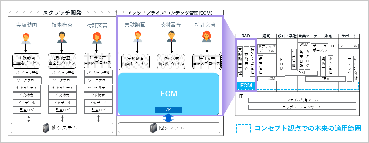 初期のECMは、コンテンツリポジトリ(格納庫)としての基本機能がメインで、そこにメタデータ管理や版管理などの機能がついている程度でしたが、その後、さまざまな機能が追加されて、ミドルウェアとして発展していきました。図3の左側の図にあるように、コンテンツを扱うアプリケーションをスクラッチで開発すると、コンテンツ管理機能を自分で作り込む必要がありました。例えば、アクセス制御などのセキュリティ関連の機能やバージョン(版)管理、検索、監査ログなどです。ECMをミドルウェアとして利用すればこれらの機能はすべてECM側に任せることができるため、アプリケーションの開発工数を短縮することができます。こうして考えると、社内にあるすべてのアプリケーションの「共通コンテンツリポジトリ」としてECMを利用するのがベストプラクティスであり、それがコンセプト観点での本来のECMの使い方であることは容易に理解できますが、その考え方がスタンダードになることはありませんでした。なぜならば、ECMはIT部門が管轄する「全社インフラ」ではなく、事業部門側が利用する「アプリケーション」として投資を検討されてしまう位置づけにあったからです。要するに「お財布が分かれる」からです。例えば、R&D部門内にコンテンツを扱う業務システムが複数あり、それらのコンテンツリポジトリを共通化するという、図3の例にあるような「事業部内」での導入検討はこれまでに何度か耳にしたことがありますが、本来のECMのコンセプトである「全社共通基盤」という話はほとんど聞いたことがありません。各部門は、自部門の仕事を最適化するためにIT投資をするわけで、中途半端な「ミドルウェア」より、開発不要のパッケージソフトやSaaSの方が良いではないかという観点も、当然あります。これらの原因でECMを全社コンテンツ管理基盤と位置付けるケースは、あまりありませんでした。