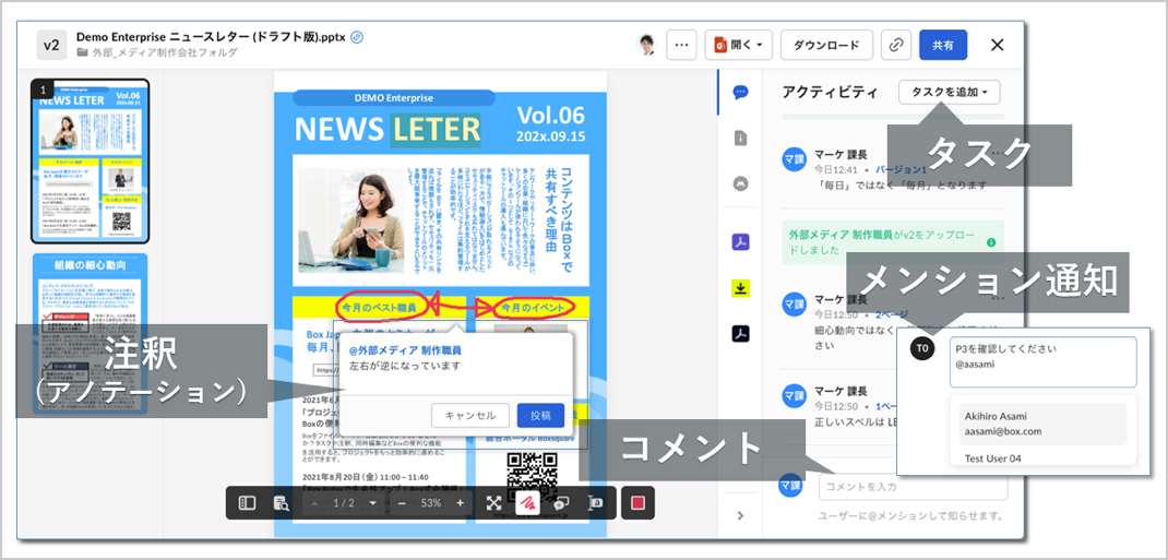 図6:コメント、メンション通知、注釈、タスクなどの便利なコミュニケーション機能