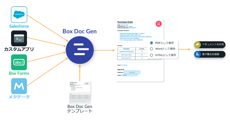 Box FormsやSalesforce、カスタムアプリなどのさまざまなデータソースからのデータを利用し、条件付き書式や表、画像、計算式などを動的に処理できるテンプレートに基づいて、ドキュメントを即座に生成できます。