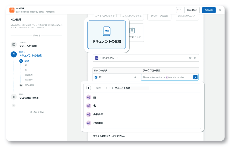 また、Box Relay を使用すれば、自社のフォーマットに合わせたドキュメントを Box Doc Gen で即座に生成できます。複数のソースからデータをマージする必要がある処理をノーコードで自動化できます。