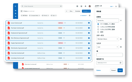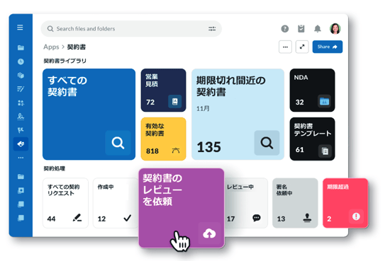 Box Appsは、ノーコードアプリツールです。たえば、「契約書」アプリでは、メタデータに基づき、文書の種類や有効期限などで対象の契約書を一覧表示できます。複数の文書に対して、メタデータを一括で付与することもできます。