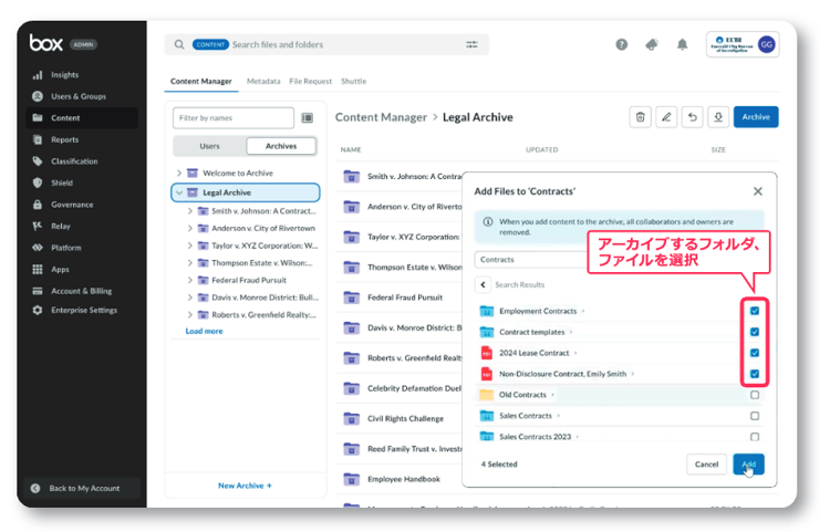 Box Archive は、保管対象のコンテンツをアーカイブ領域に移動し、変更できなくすることで、最終更新状態のまま保管できる機能です。アーカイブされたコンテンツはエンドユーザーからはアクセスできなくなり、ファイル検索結果からも除外されます。